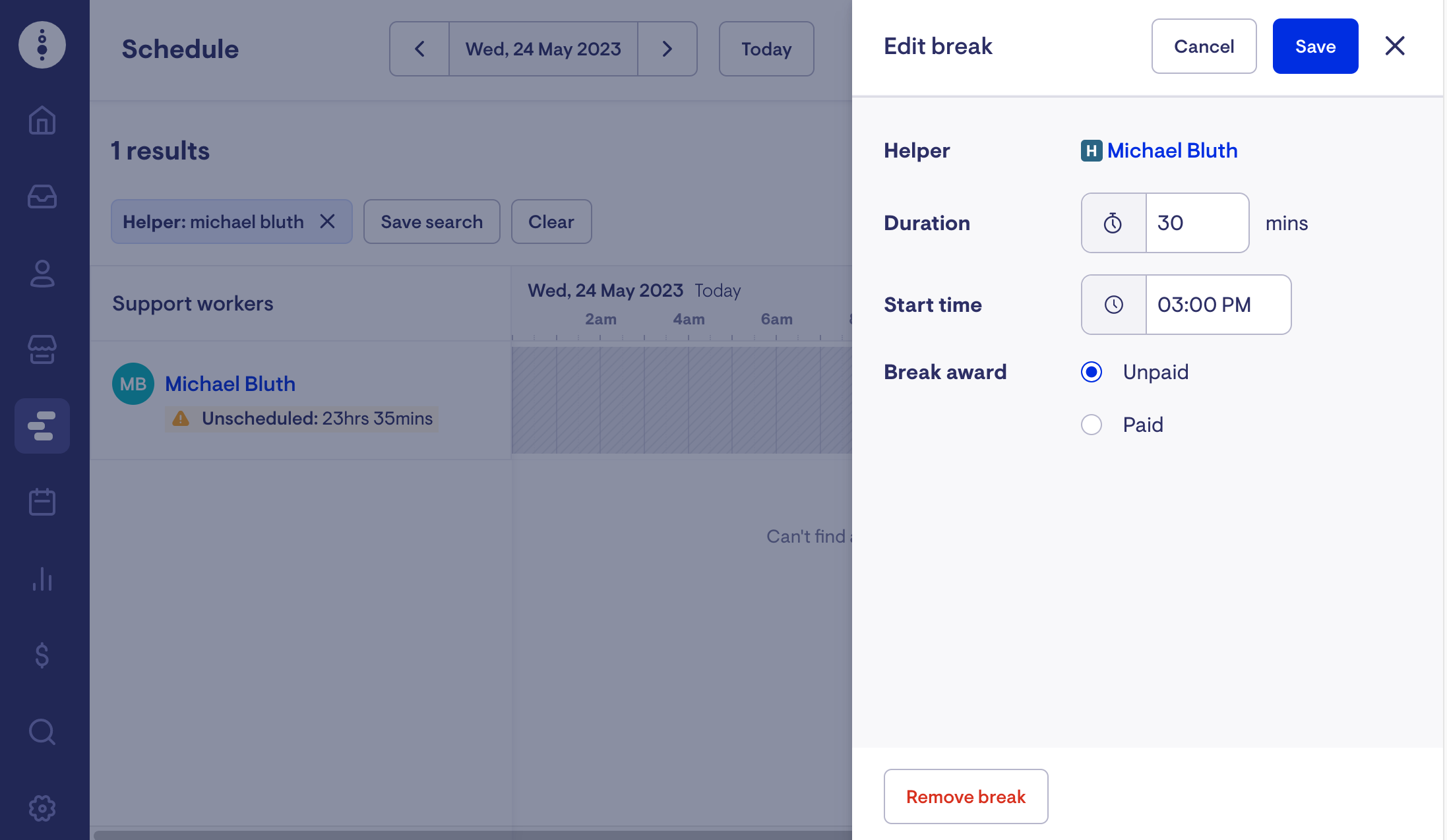 Automatic breaks can be edited (or removed) from within a shift. This provides added autonomy for rosterers during exceptions.