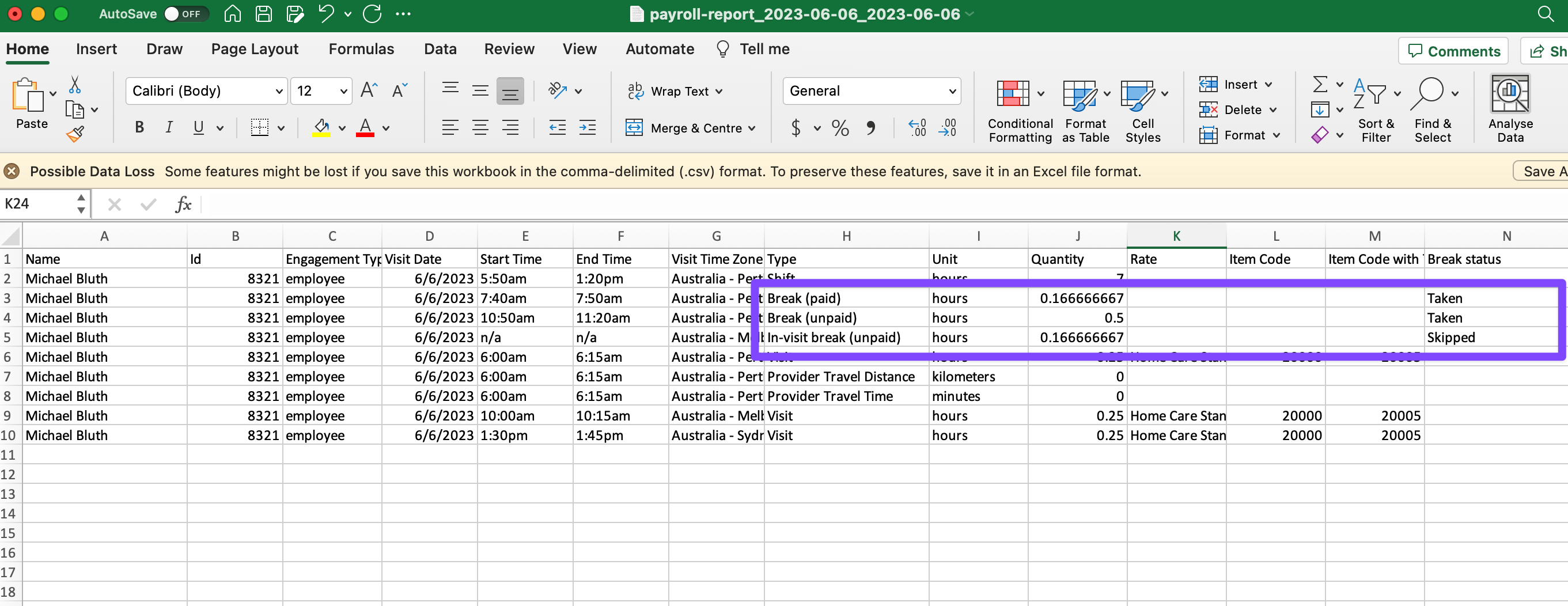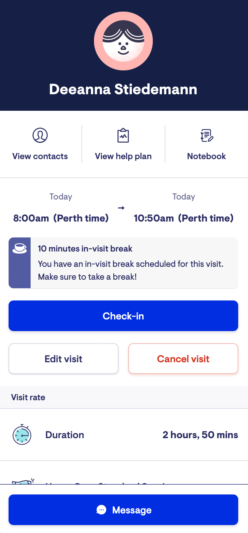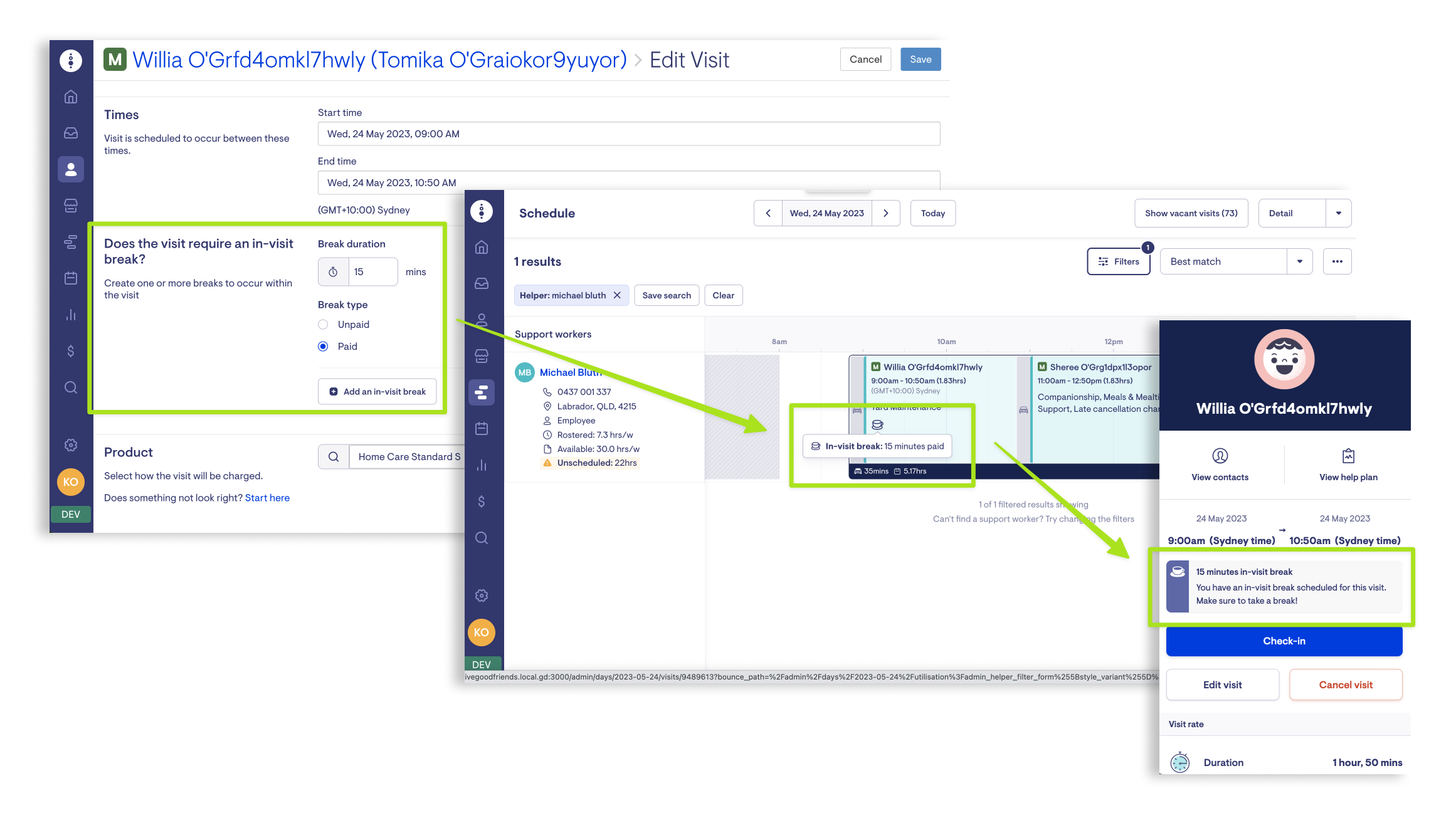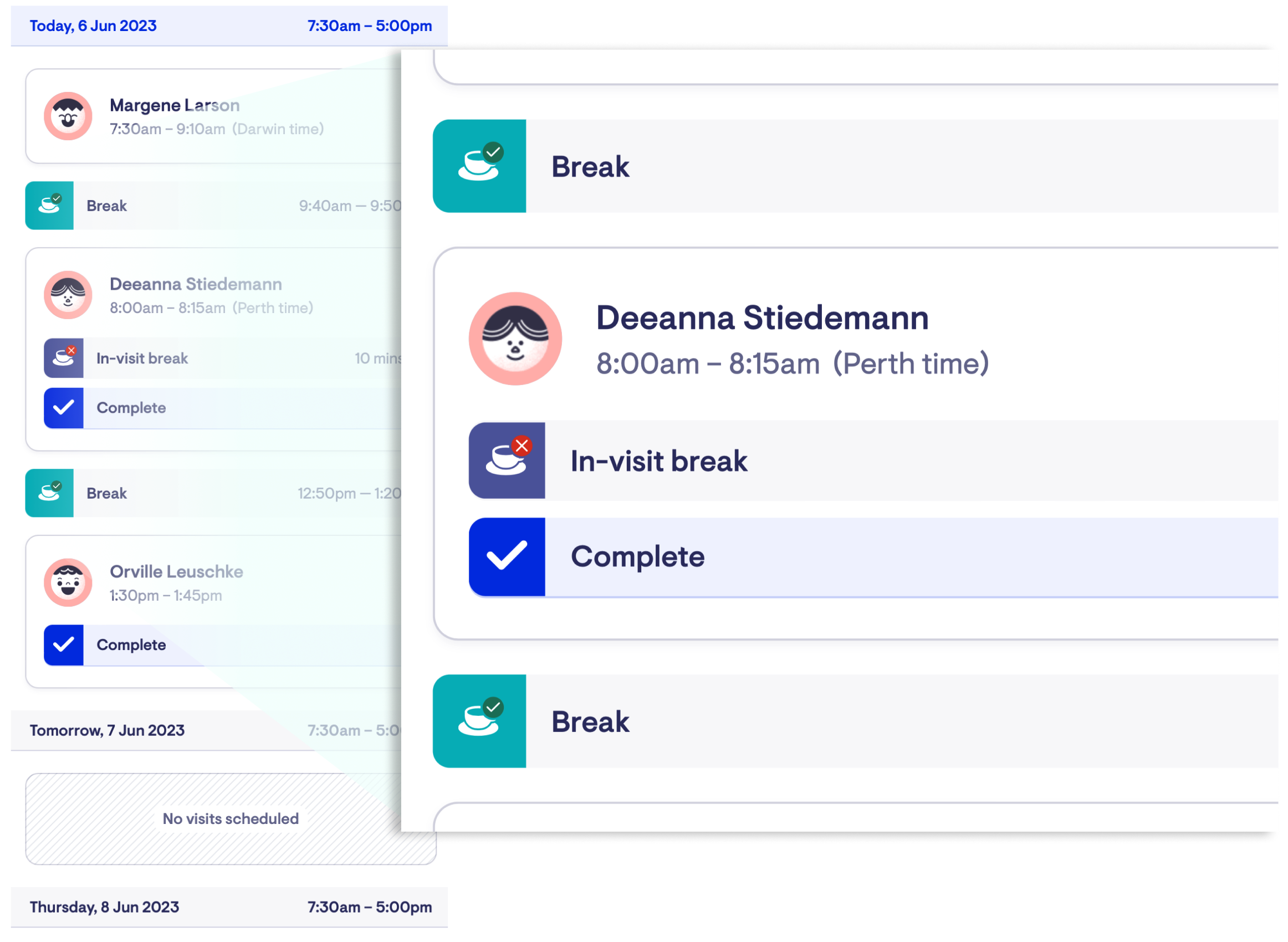 If an in-visit break is manually scheduled by the rosterer, automatic breaks will adjust accordingly to avoid unncessary breaks.