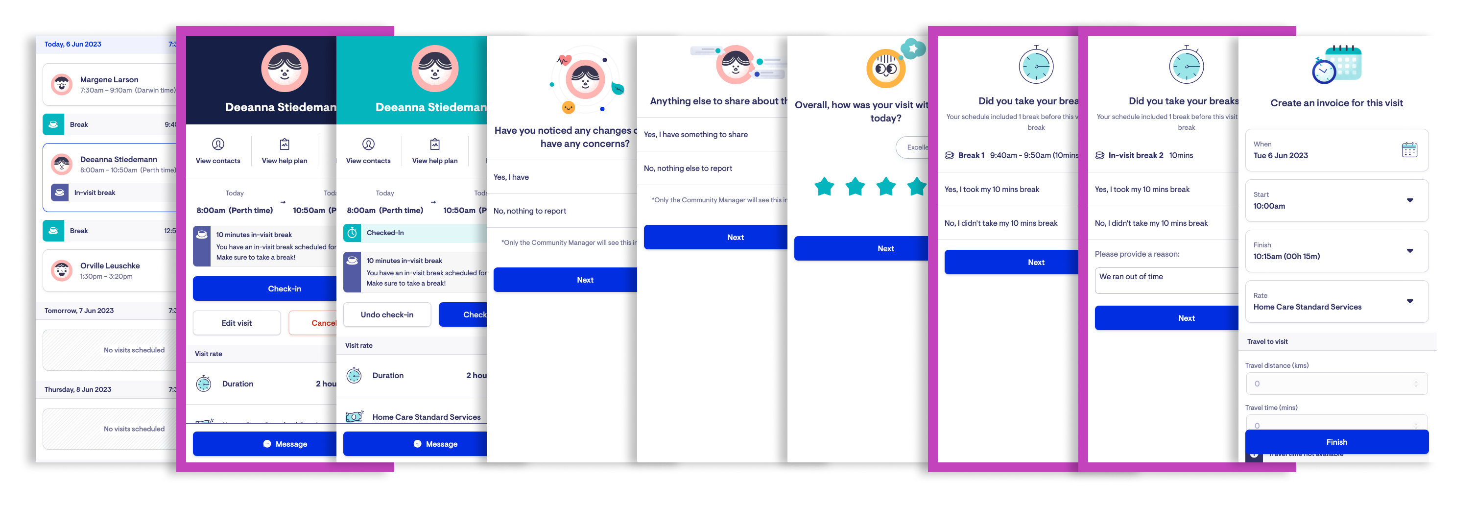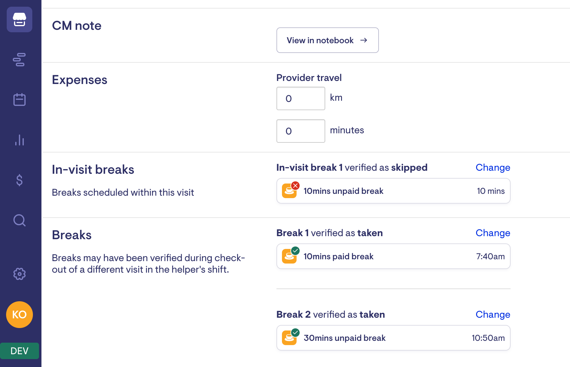 Breaks are displayed within the care and admin schedules and verified at each incremental checkout, whether in-visit or as part of a shift. These verifications subsequently become part of the visit's punchcard, allowing admin staffers to amend these verifications as necessary.