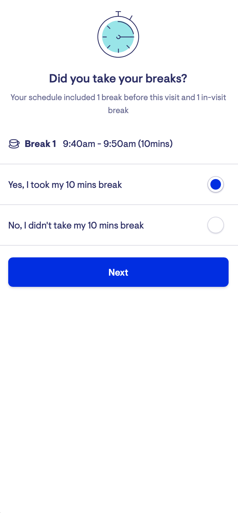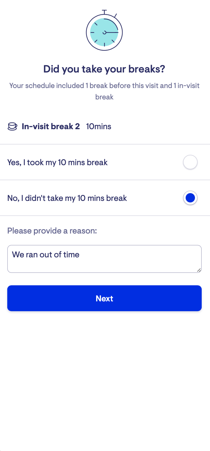The first view below shows the worker being reminded of their in-visit break (intended within the visit to which they're about to check in). The final two screens are the worker being asked to verify the breaks scheduled before this checkout. You'll note responding with a "no" requires the worker to provide a reason.