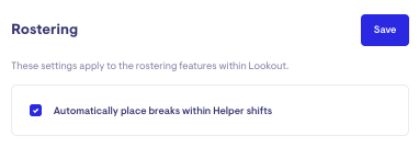 Navigate to 'Settings', click 'Rostering' and enable the 'Automatically place breaks within Helper shifts' option.