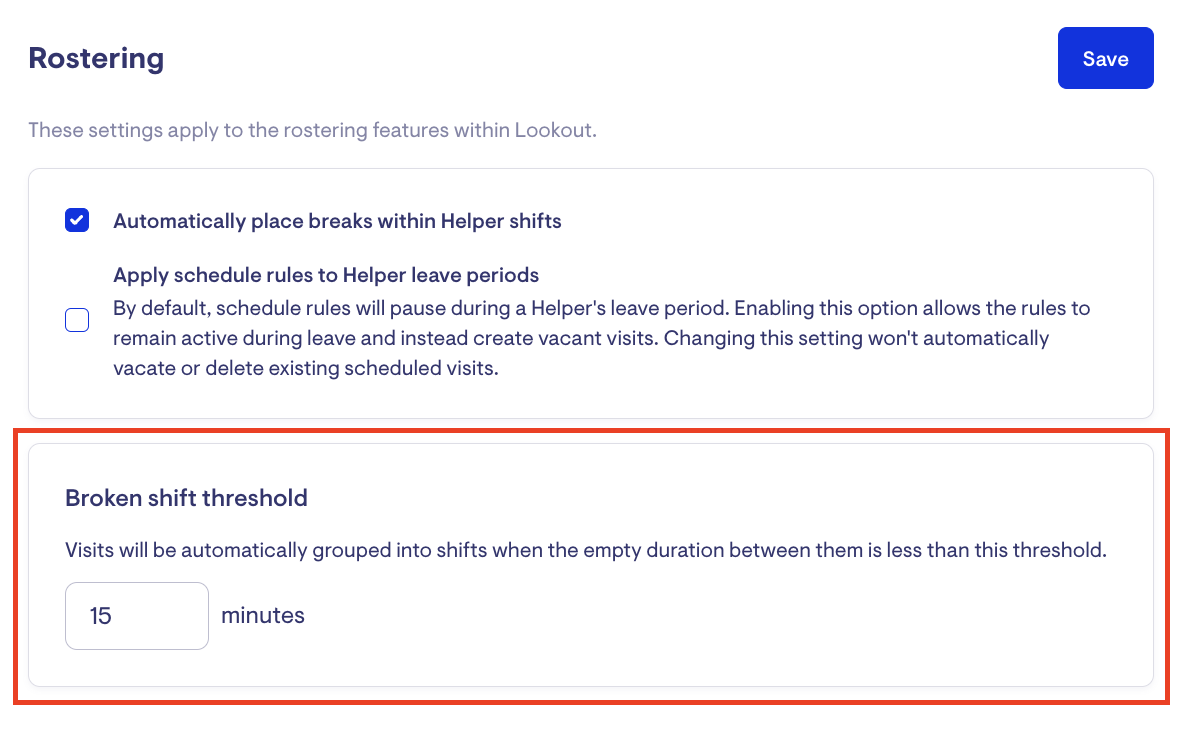 Lookout will automatically group visits into shifts when the empty duration between them (including breaks and travel time) is less than the 'Broken shift threshold' defined by your organisation and set under the Rostering menu within 'Settings'.