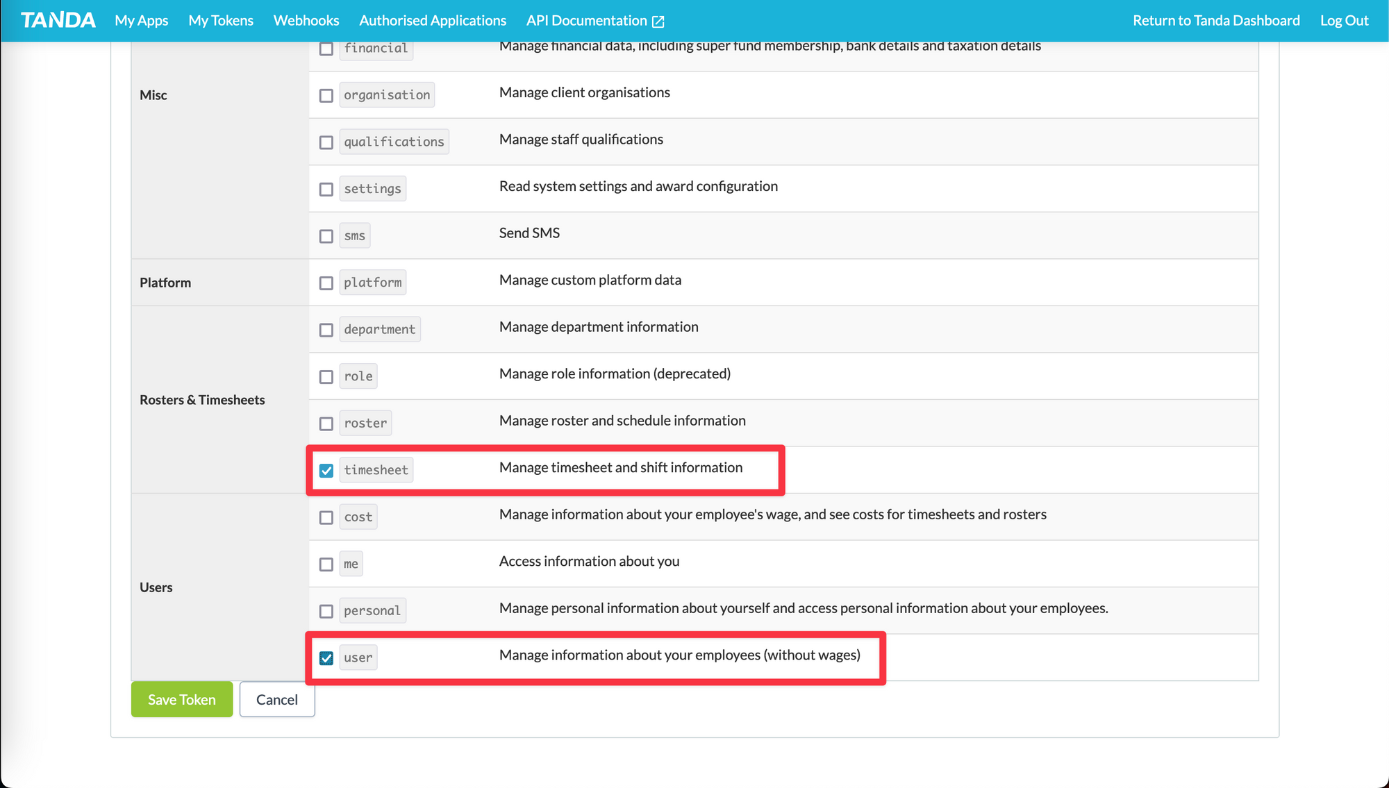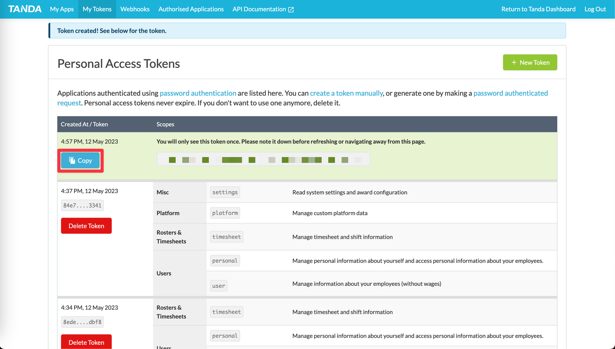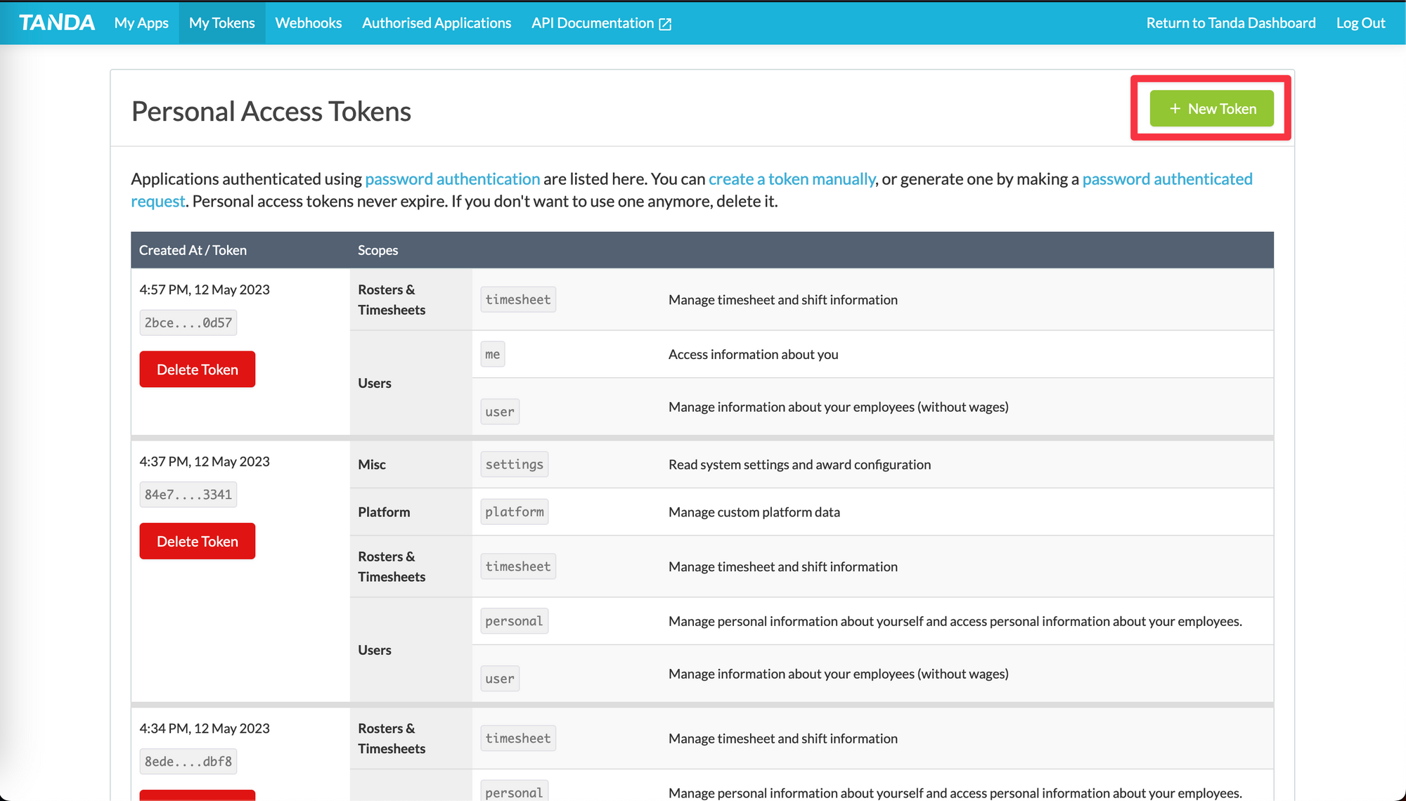 To do so, head to https://my.tanda.co/api/oauth/access_tokens and select “new token”.