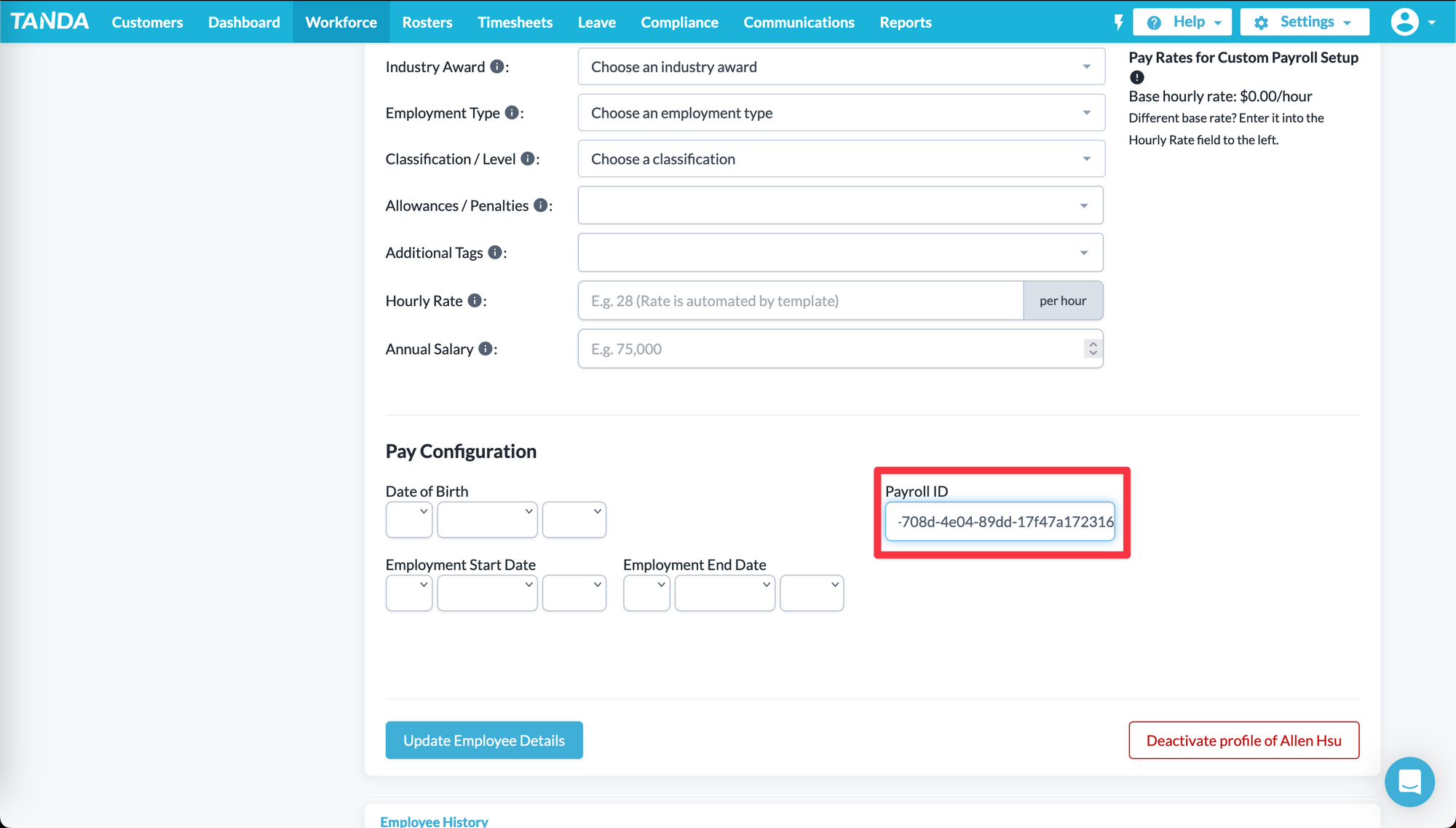At the bottom of the page is a field called “Payroll ID”. Copy the UUID from Lookout into this field and save the worker’s Tanda profile. This will ensure that the sync between the two profiles is correct.