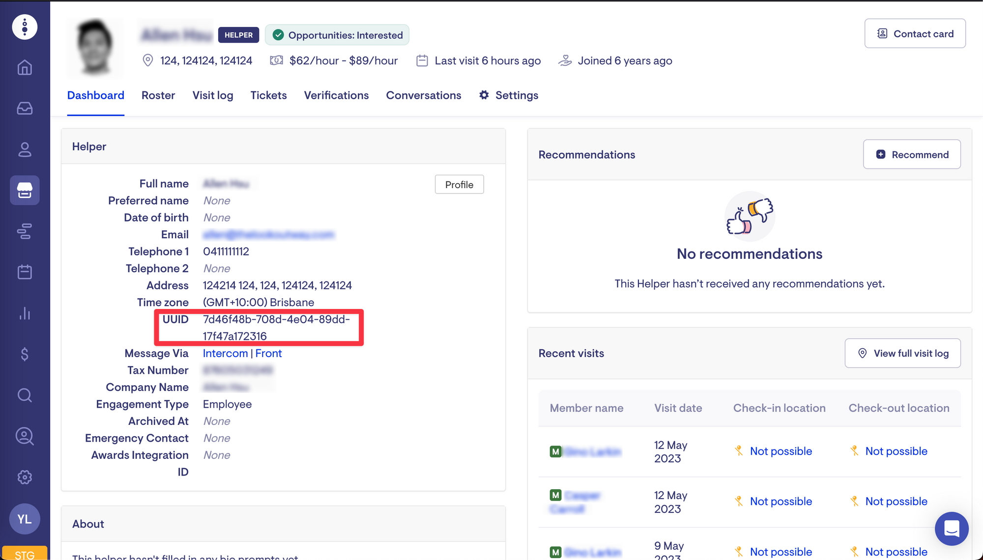 If the Care Worker (Helper) already exists in Tanda as a staff member, their Lookout UUID must be added to their Tanda Payroll ID field to create a link between their profile on Lookout & Tanda. Learn more.