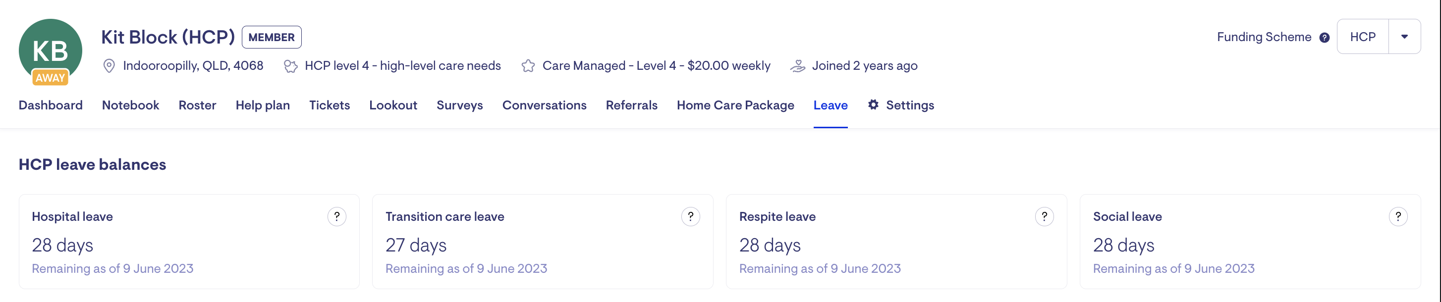 Member leave balances are tracked automatically for HCP members. Lookout takes the leave periods and calculates the remaining balance for each type of leave (e.g. hospital, respite, etc.). These are displayed above the membership's leave listing.