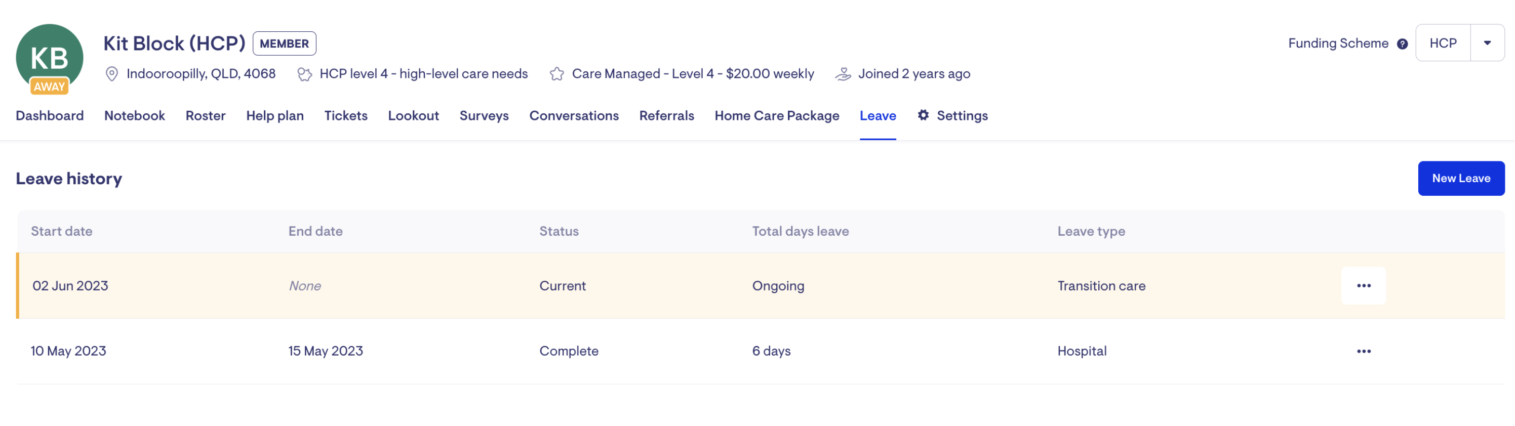 You can now capture periods a member is on leave, such as during a hospital visit or respite, directly within Lookout.