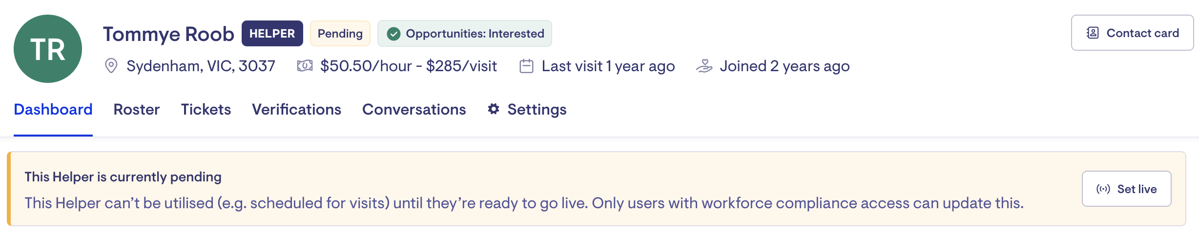 Setting a 'Pending' flag on a helper will require admin staff to have the Workforce Compliance access role.