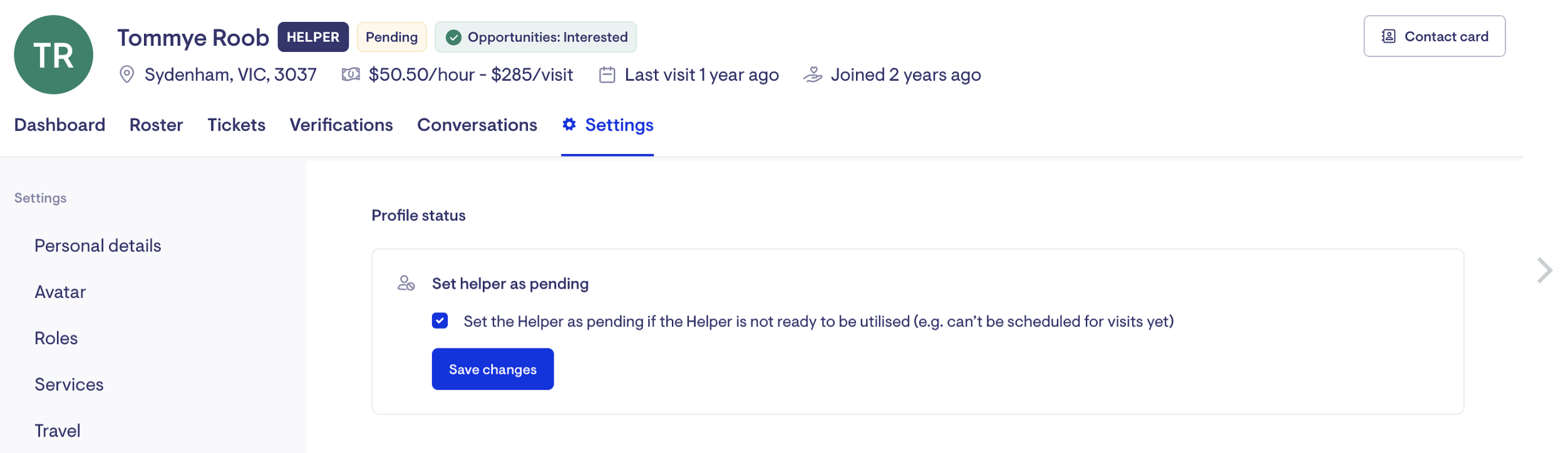 We have added a new feature that allows you to flag a helper as 'Pending'. This feature safeguards Rosterers, preventing them from accidentally scheduling visits with these new helpers while they are being onboarded.
