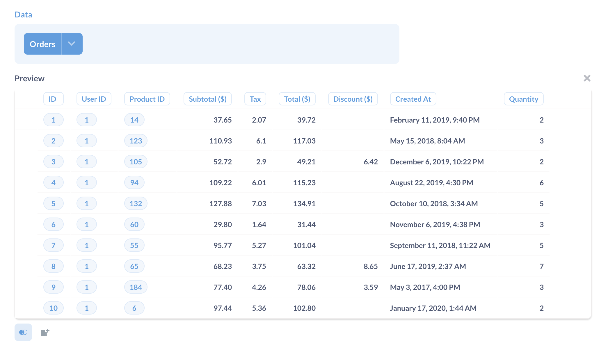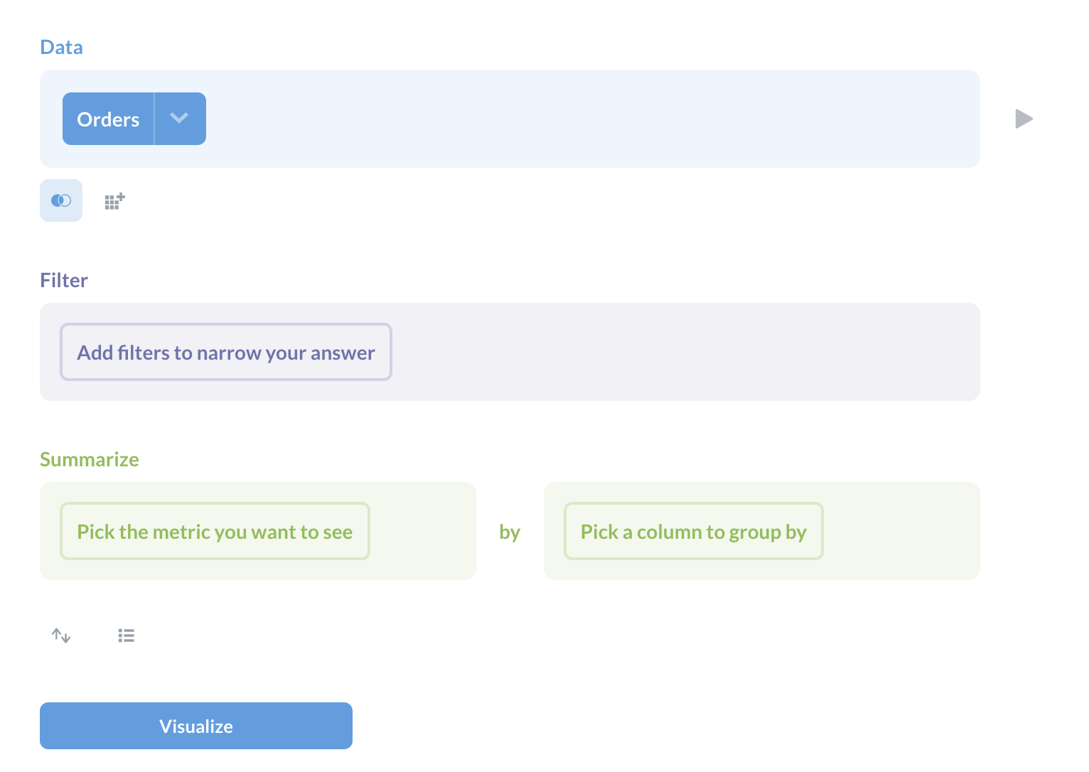 Once you select your data, you will be taken to the query builder. Say you selected Raw data > Sample database > Orders, then you’ll see something like this: