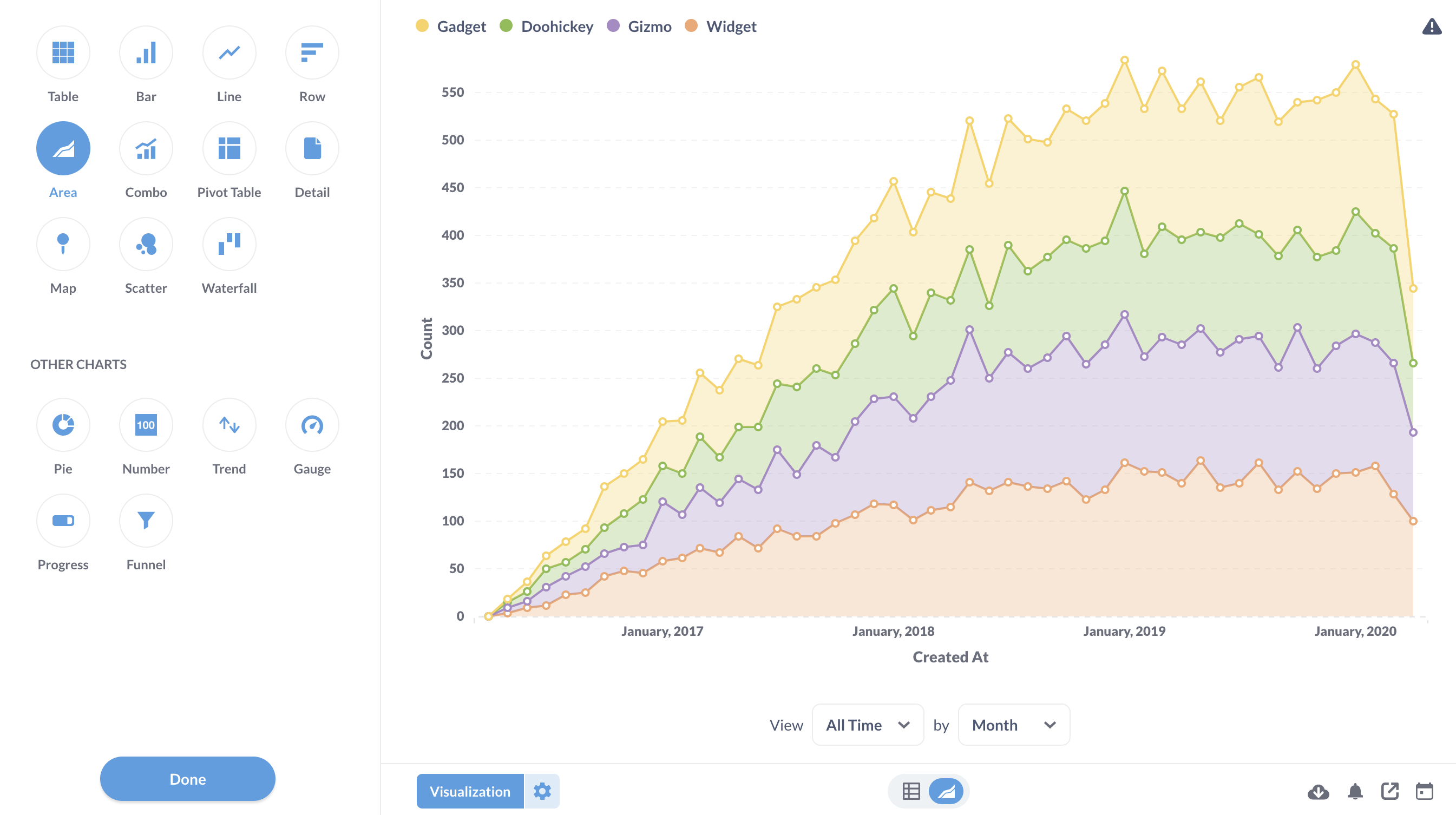 Dashboards group questions and present them on a single page. Build collections of questions and arrange tables, charts, and text cards on a dashboard.