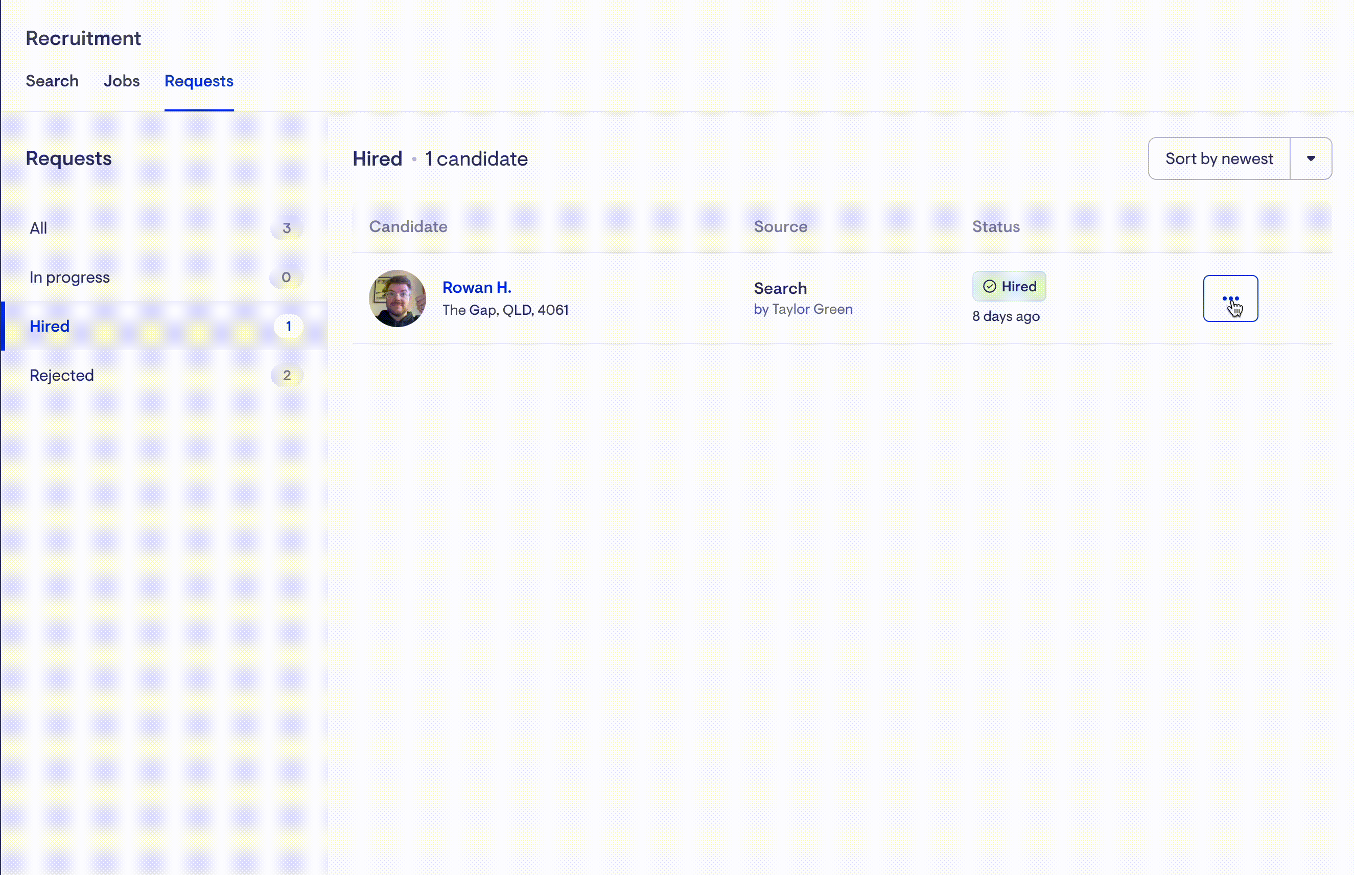 Requests - The requests area enables you to keep track of all the candidates you've scheduled for interviews, rejected or hired. You can also add notes to communicate internally and share feedback. It's a simple and efficient way to manage your recruitment tasks.