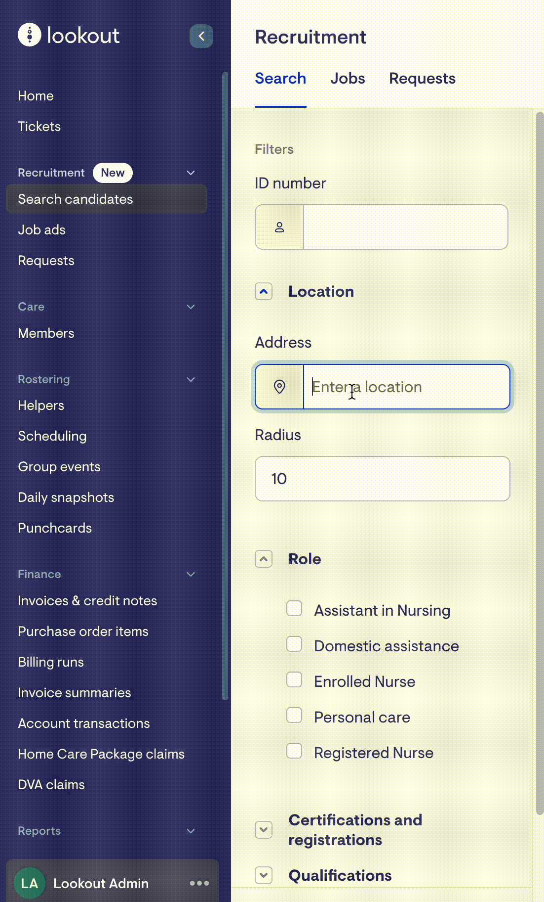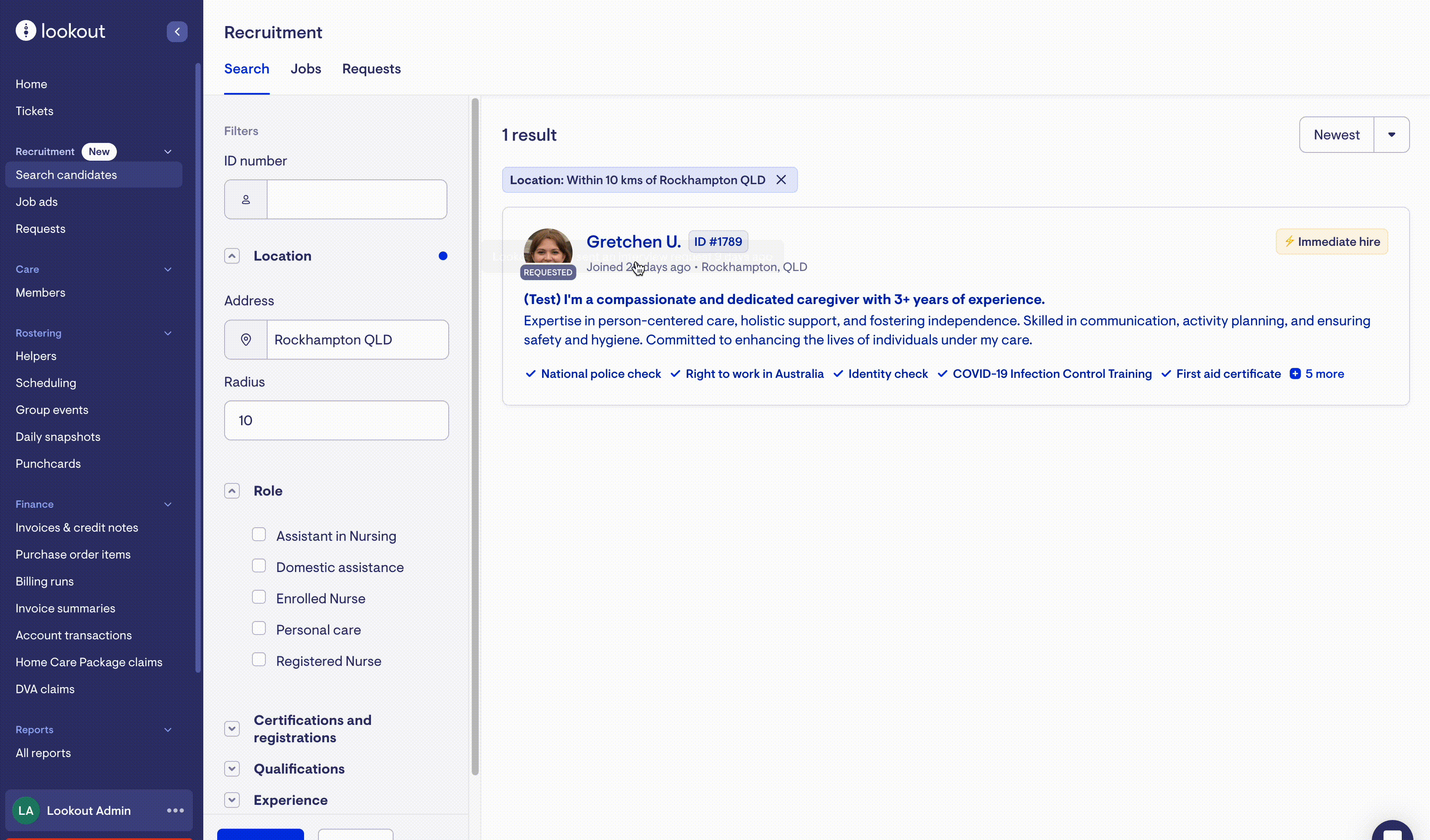 With Lookout Connect, finding the perfect care worker for your organisation is easy. You can search and filter candidates based on role, location, qualifications, and other essential criteria. The search results provide comprehensive candidate profiles, including detailed information on their experience, skills, and qualifications.