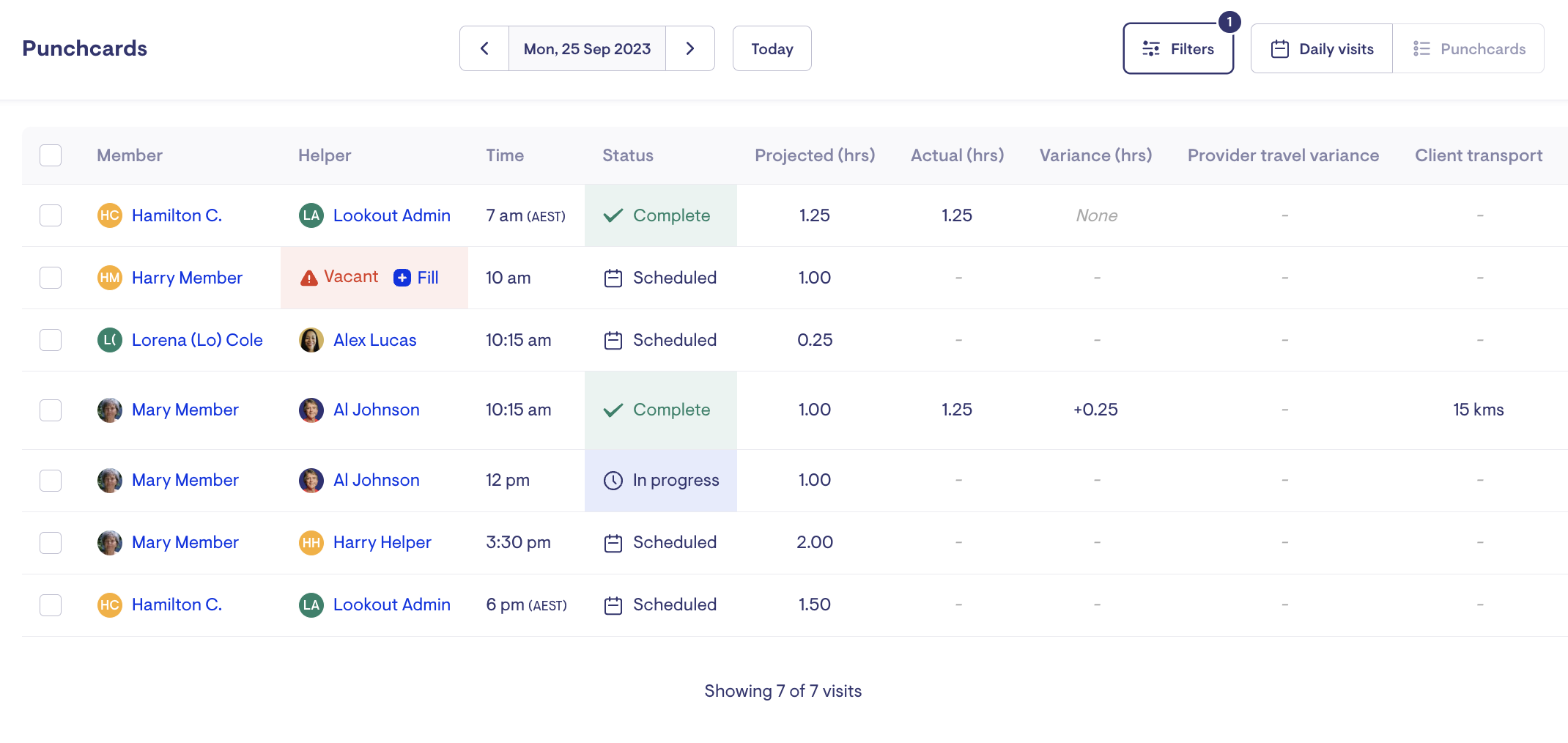 Punchcards show a daily view of all visits, their status and any variances between what was rostered and submitted by a Care Worker (Helper) when checking out a visit.