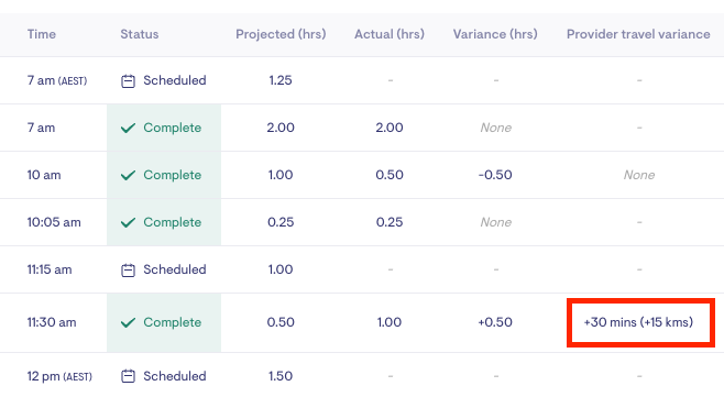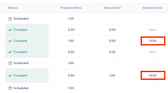 Variances between the expected and actual duration will be highlighted in the 'Variance (hrs)' column for Admin Staff to review.