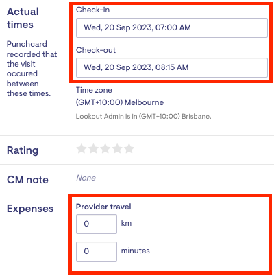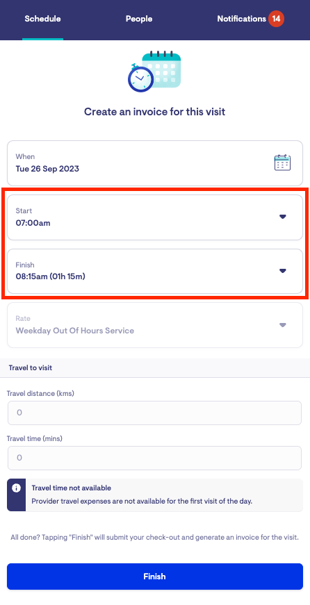 The actual visit duration is based on the Start/Finish time confirmed by the Care Worker (Helper) when checking out of a visit. The Start/Finish time is prefilled with the rostered time, enabling a Care Worker (Helper) to indicate if they stayed later or left earlier than expected.