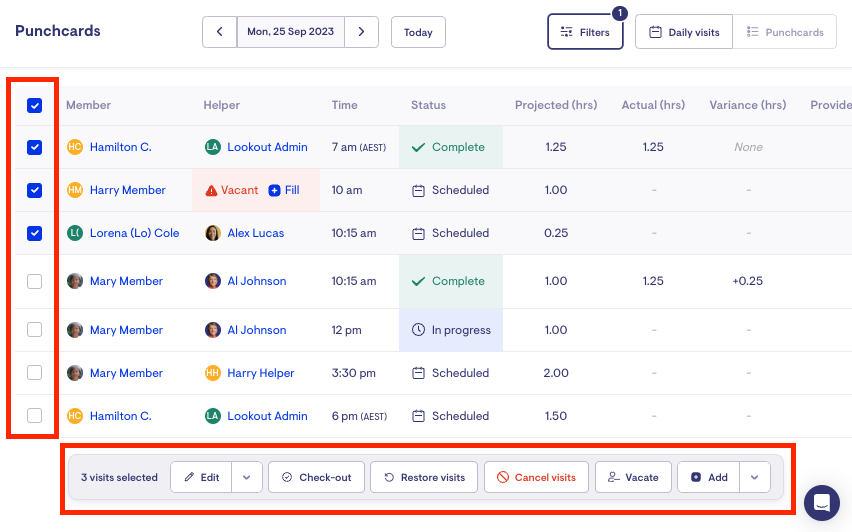 Bulk visit changes can be applied on the Punchcards view to help quickly update visits.