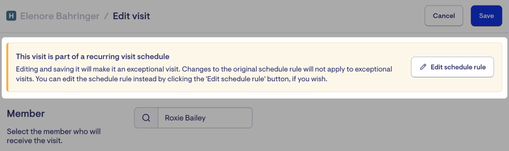 Visits will now clearly indicate if they are part of a recurring schedule. We've added a link to edit the schedule rule associated with the visit to make it easier to manage recurring visits.