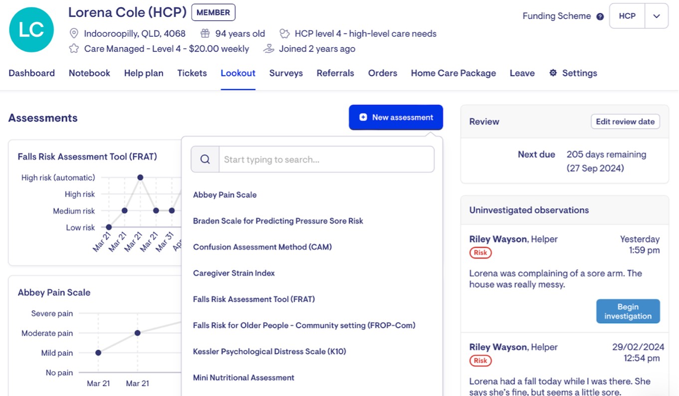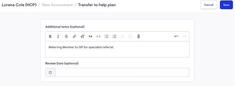 The completed assessment can be transferred to the client’s Help Plan with additional notes and a review date.