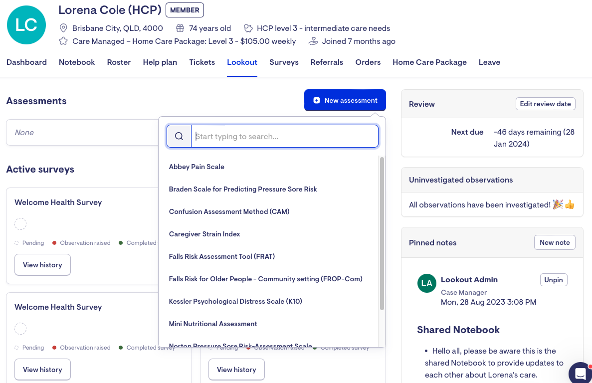 To complete a new Mini Nutritional Assessment, navigate to the Lookout tab on a Membership and click āNew Assessmentā.