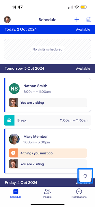 The Care app has an automatic refresh feature that updates the schedule view with the latest information every 5 minutes, in addition to the existing manual refresh button.