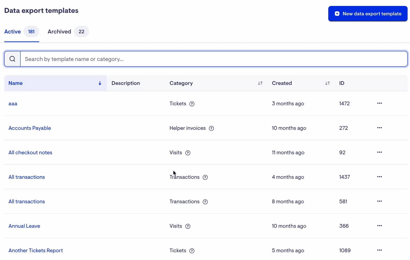 The Data exporter now supports template duplication for added convenience. We've also made it easier to find your custom reports by allowing you to sort templates by name, category, and creation date.