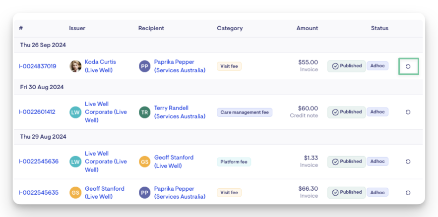 Invoice reversal can now be performed directly on the Invoices & Credit Notes page and within the Billing Run. Categories are displayed for improved visibility, and sticky date headers help easily identify invoice groups.