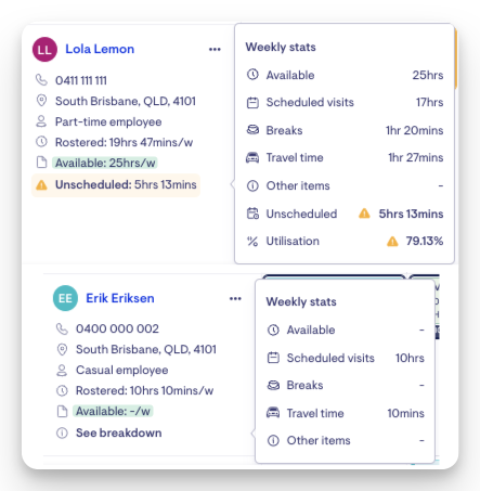 Previously, helper Weekly stats were only available when a helper's availability was added. For improved visibility, Weekly stats will now appear when Rostering staff hover over Unscheduled, Overscheduled and See Breakdown even if availability hasn’t been configured. Additionally, the breakdown has been updated to provide better insights into worker utilisation.